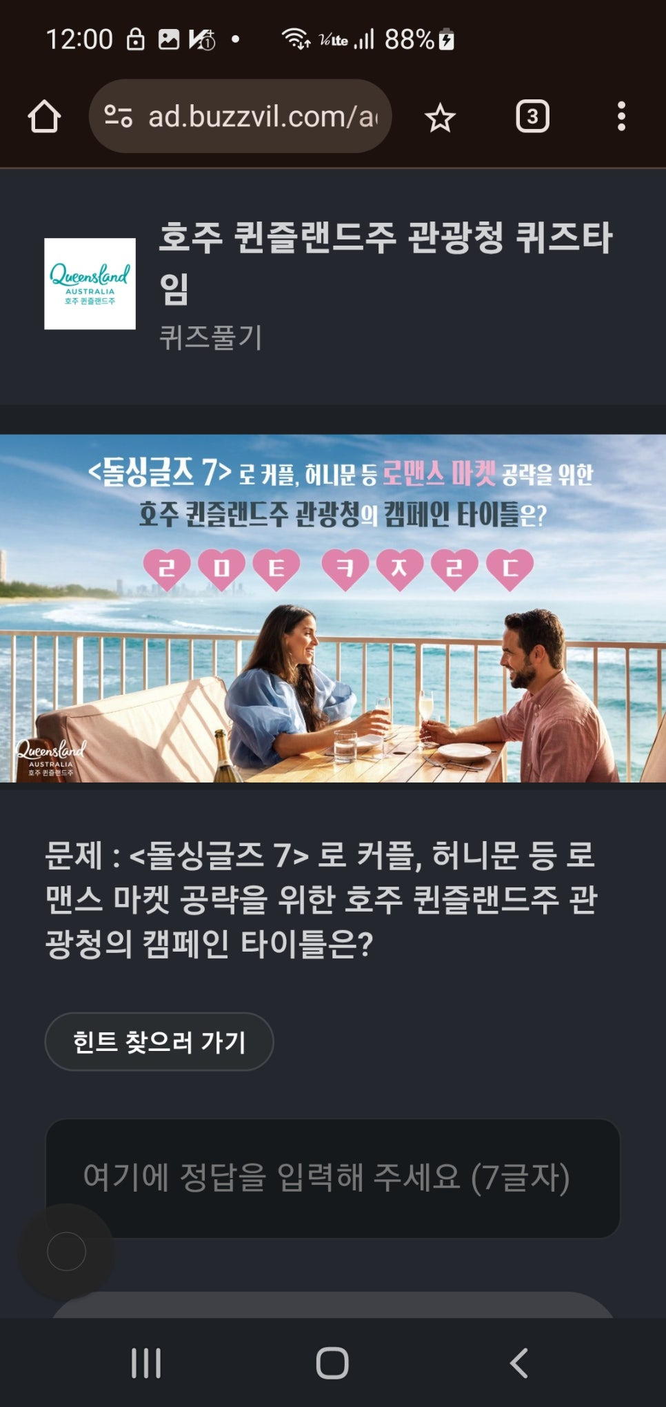 문제: <돌싱글즈 7> 로 커플, 허니문 등 로맨스 마켓 공략을 위한 호주 퀸즐랜드주 관광청의 캠페인 타이틀은?