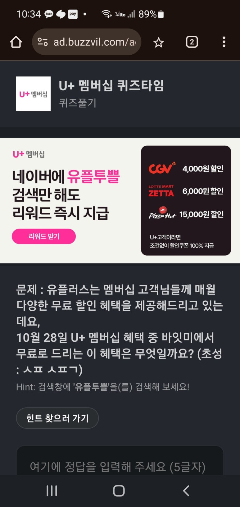 카테고리 없음 U+ 멤버십 초성: ㅅㅍㅅㅍㄱ 초성ㅅㅍㅅㅍㄱ ㅅㅍ ㅅㅍㄱ by curcopilot 2025. 10. 28. U+ 멤버십 퀴즈 타임 2025.10.28(화) 문제: 유플러스는 멤버십 고객님들께 매월 다양한 무료 할인 혜택을 제공해드리고 있는데, 10월 28일 U+ 멤버십 혜택 중 바이미에서 무료로 드리는 이 혜택은 무엇일까요? (초성: ㅅㅍ ㅅㅍㄱ) 유플러스 멈버십 고객 퀴즈 정답 유플러스 멈버십 고객 퀴즈 정답 유플러스 멈버십 고객 퀴즈 정답 유플러스 멈버십 고객 퀴즈 정답 문제: 유플러스는 멤버십 고객님들께 매월 다양한 무료 할인 혜택을 제공해드리고 있는데, 10월 28일 U+ 멤버십 혜택 중 바이미에서 무료로 드리는 이 혜택은 무엇일까요? (초성: ㅅㅍ ㅅㅍㄱ) 반응형 공유하기 게시글 관리 curcopilot 저작자표시 비영리 변경금지 (새창열림)